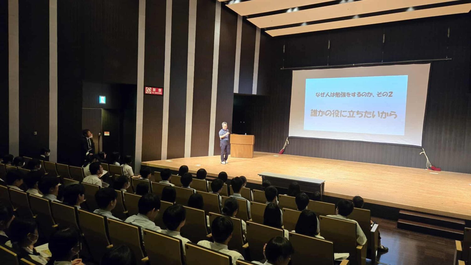 清明学院高校の生徒たちには、しっかりと努力して能力を高め、老後も困らないほどの資産を手に入れる重要性、それを使って他者の役に立とうとする社会性、生きているうちに自分の能力をどこまで高められるかに挑もうとするチャレンジ精神を大切にして、これからも努力してほしいと訴えた。