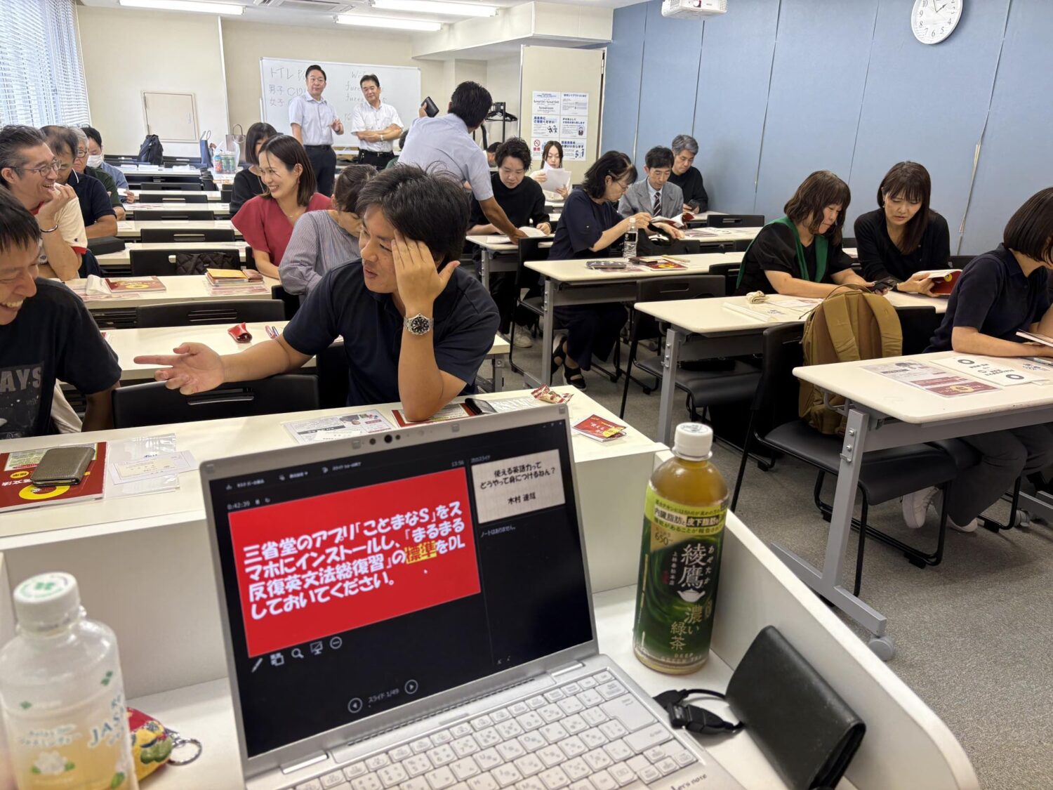 英文法の勉強は「理解」→「刷り込み」→「アウトプット(SW)」だが、三省堂のアプリは単語テストも瞬間英作文もできる優れもの。参加された先生方がセミナー中にアプリで遊んでおられた。そろそろ僕の説明を聞きましょかと言うと、皆さん、はっと我に返り、アプリに没頭していましたと笑っておられた。