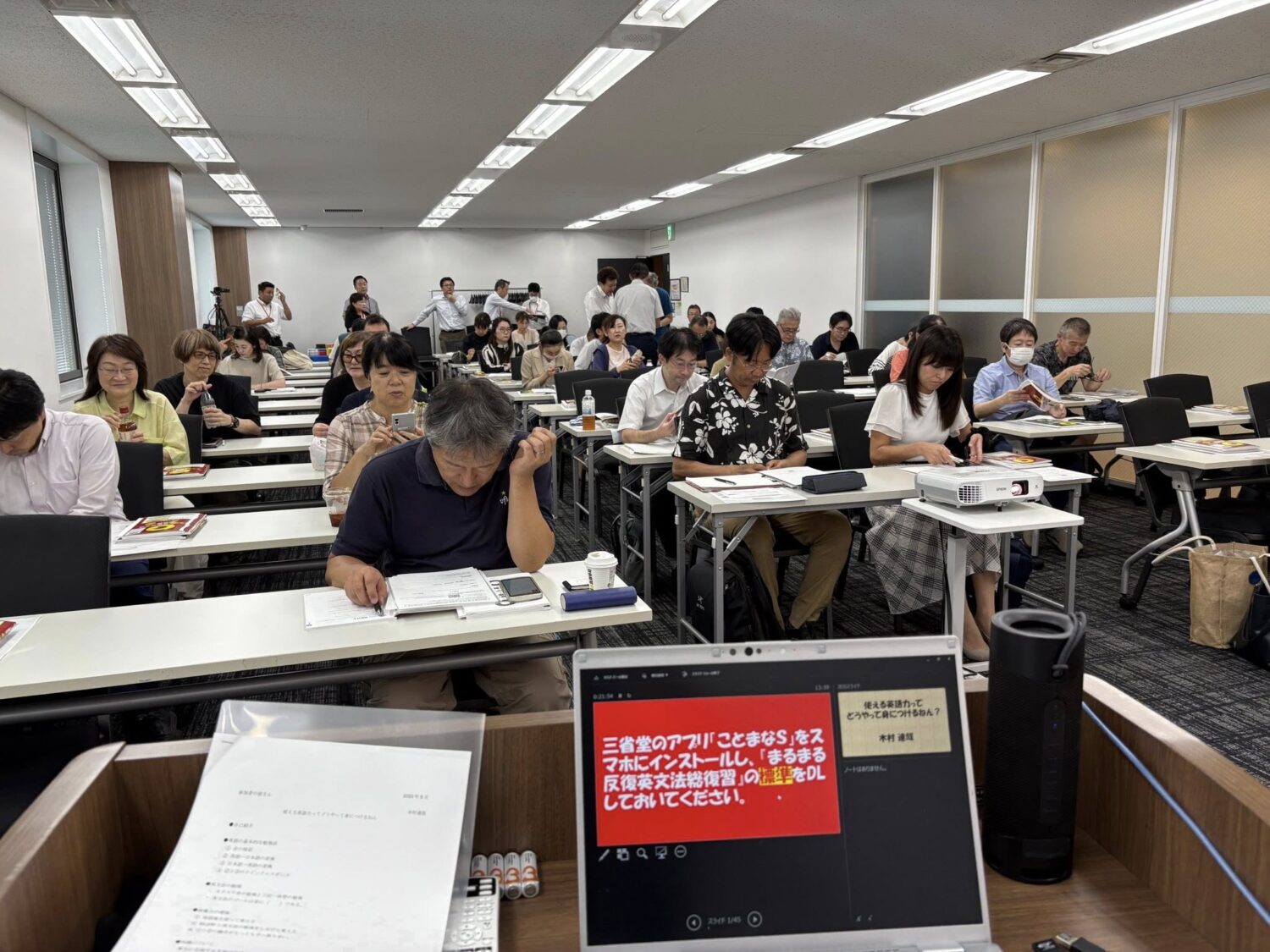 14時前から始まったセミナーは満席。昨年の同社主催セミナーにもいらっしゃった英語塾経営者の女性たち、アルクのにいらっしゃった先生、昨日オンラインのに参加された先生、もちろん初めて木村のセミナーに参加したという方々も多数ご参加くださった。返す返すもありがたいことだ。